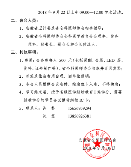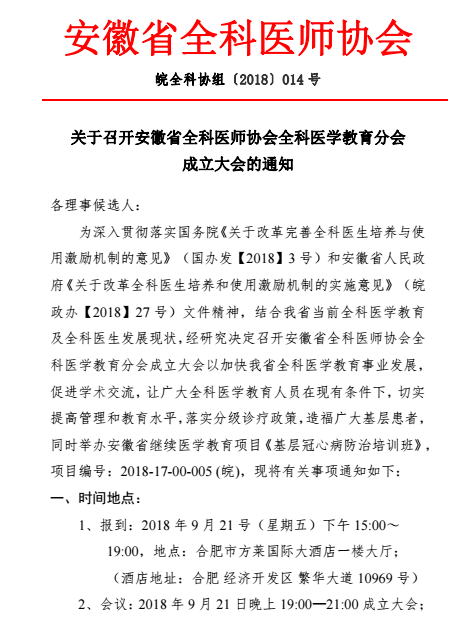 關(guān)于召開安徽省全科醫(yī)師協(xié)會全科醫(yī)學(xué)教育分會成立大會通知